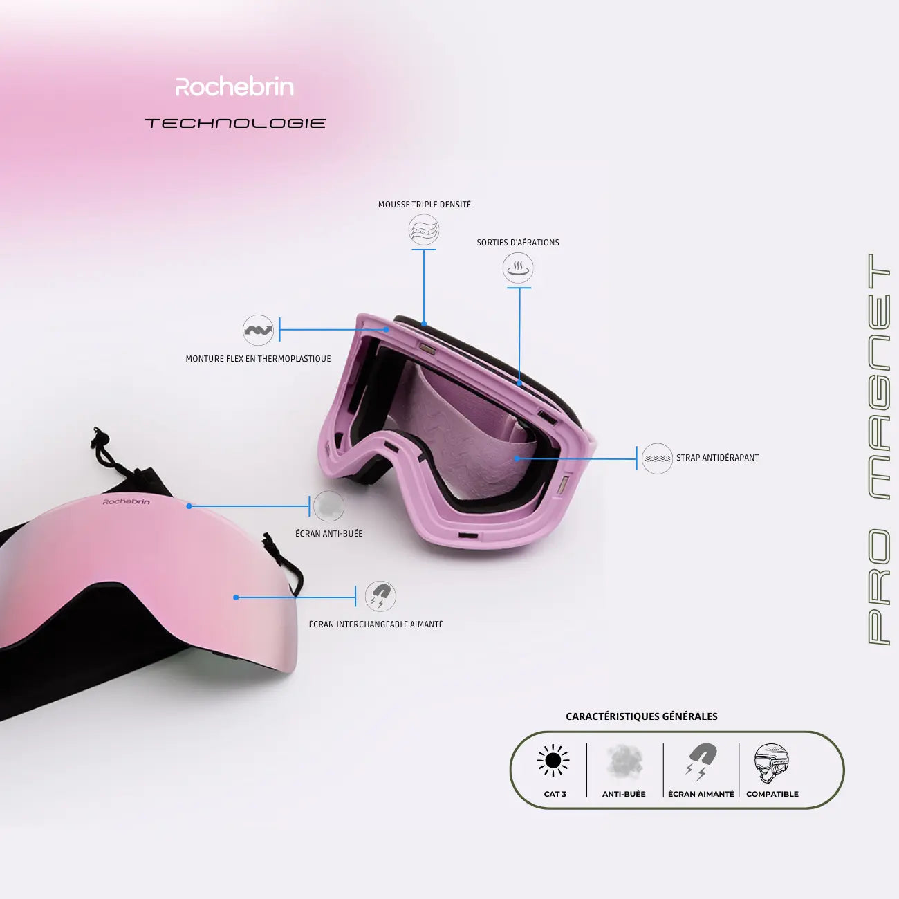 Conçu pour répondre aux exigences des skieurs les plus engagés, le Pro Magnet associe un écran en polycarbonate à un système magnétique d’échange rapide, pour une adaptation instantanée aux conditions météo. Sa monture en TPU hyperflexible absorbe les chocs sans se déformer, tandis que sa triple mousse avec finition en velour assure un confort durable, même par grand froid. Doté d’un double écran anti-buée et de sorties d’aération latérales, il garantit une visibilité claire en toute situation. Le bandeau à grip silicone offre une stabilité maximale sur le casque, sans glissement.
