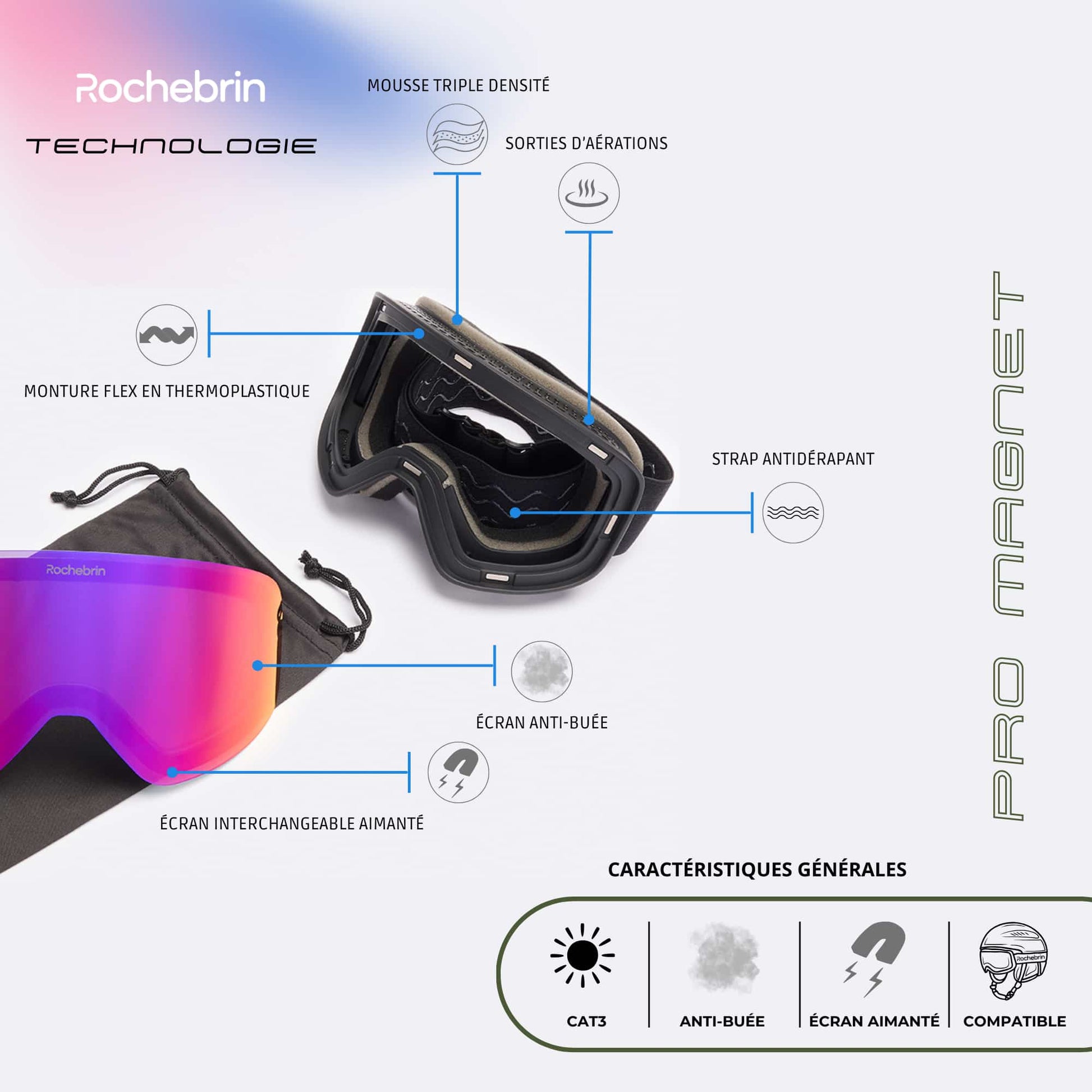 Pensé pour les skieurs qui exigent confort et adaptabilité, le Pro Magnet combine un écran aimanté en polycarbonate avec une monture flexible en thermoplastique, offrant une protection totale et une tenue impeccable. Sa triple mousse avec finition velours assure un contact doux et stable, même en mouvement. Grâce à son traitement anti-buée et à son double écran, la vision reste claire, même en conditions extrêmes. Compatible avec les clips optiques Rochebrin, il s’adapte aussi à votre vue, sans compromis sur le maintien ni le style.